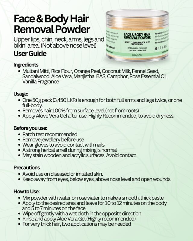 Remove unwanted hair easily and painlessly at home with Face & Body Hair Removal Powder. This gentle, traditional formula leaves your skin smooth, soft, and refreshed. No salon visits, no stress, just silky skin on your schedule. Suitable for face and body, upper lips, chin, neck, arms, legs, and bikini area. Do not apply above nose level.
