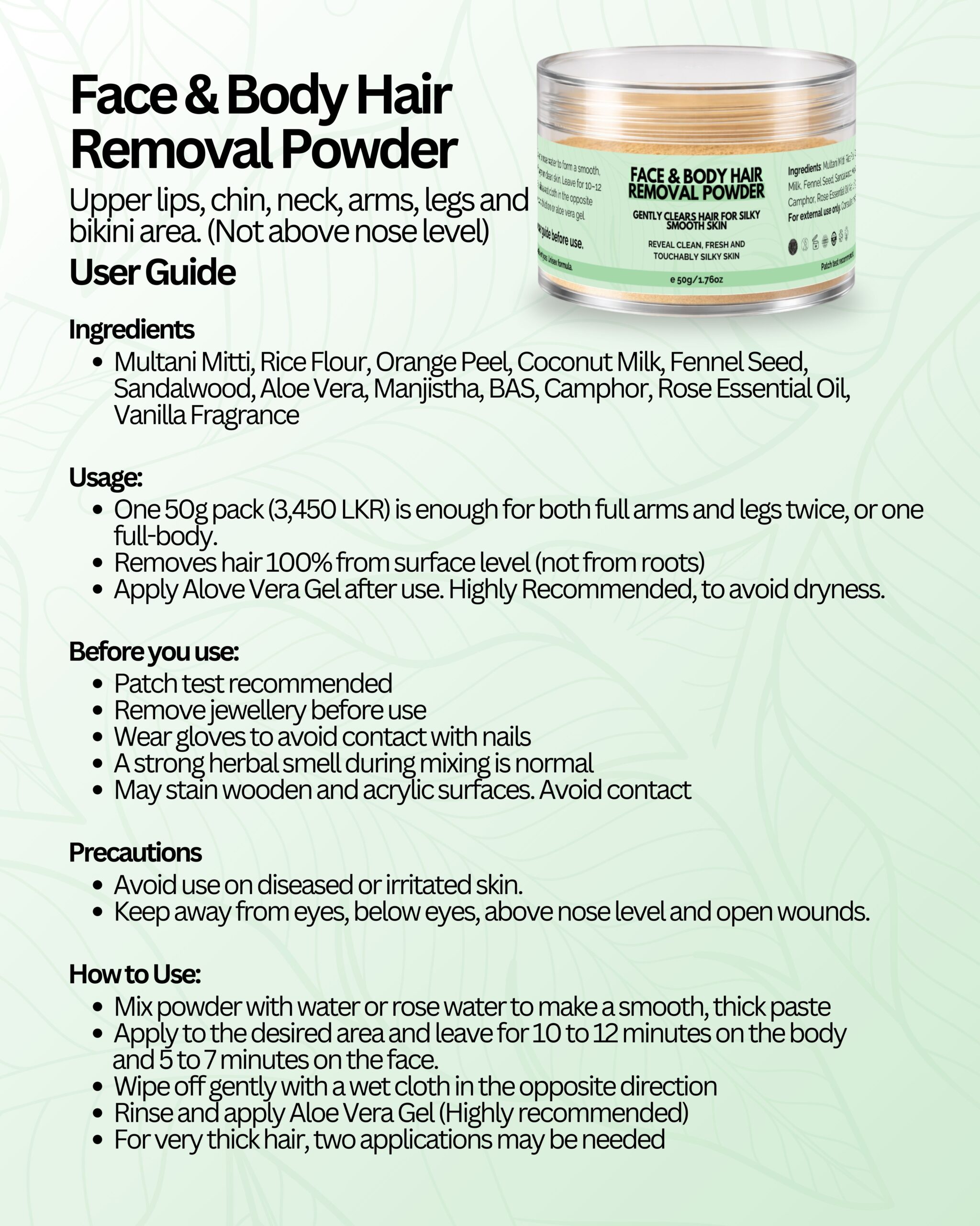 Remove unwanted hair easily and painlessly at home with Face & Body Hair Removal Powder. This gentle, traditional formula leaves your skin smooth, soft, and refreshed. No salon visits, no stress, just silky skin on your schedule. Suitable for face and body, upper lips, chin, neck, arms, legs, and bikini area. Do not apply above nose level.