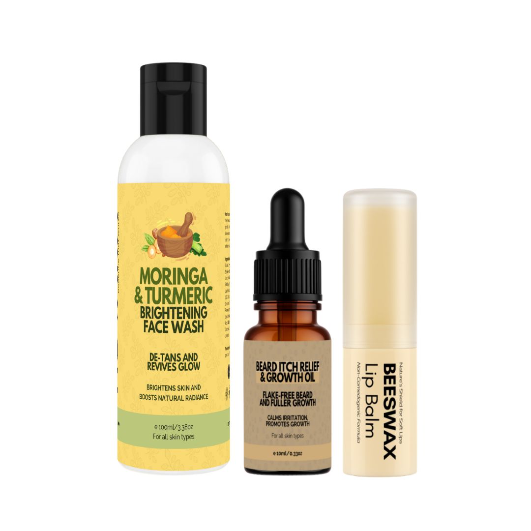 Cleanse and brighten your skin with the Moringa & Turmeric Face Wash, crafted to remove impurities while enhancing natural radiance. Keep your lips soft and protected with our nourishing Beeswax Lip Balm, designed to moisturize without clogging pores. Finish with our Beard Itch & Growth Oil, a powerful blend that soothes irritation, moisturizes the skin beneath, and supports healthier, fuller beard growth.