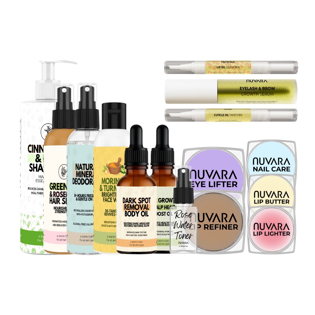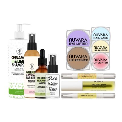 Experience complete head-to-toe pampering with The Lip, Eye, Nail, Hair, Face & Body Care Gift Pack—a luxurious all-in-one collection designed for total self-care. Hydrate and protect your lips, nourish lashes, and strengthen nails and cuticles with our targeted beauty essentials. Revitalize your hair and scalp with our soothing hair treatment, cleanse and brighten your complexion with our gentle face care, and finish with a body-nourishing formula that leaves skin soft, smooth, and radiant.